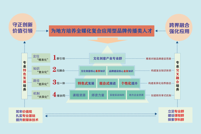 学院开办文化创意人才培养实验班,探索文化创意人才跨学科、跨专业培养。目前学院建设省级文化产业品牌建设与传播教学团队1个,省级课程思政教学名师及团队1个,建设省级课程思政示范课程1门。建设国家级一流本科课程1门,省级一流课程4门;建设省级虚拟仿真实验教学中心1个、省级实验教学示范中心1个、省级校企合作实践教学基地1个,建设品牌文化、规范语言、新媒体3个创新工作室。