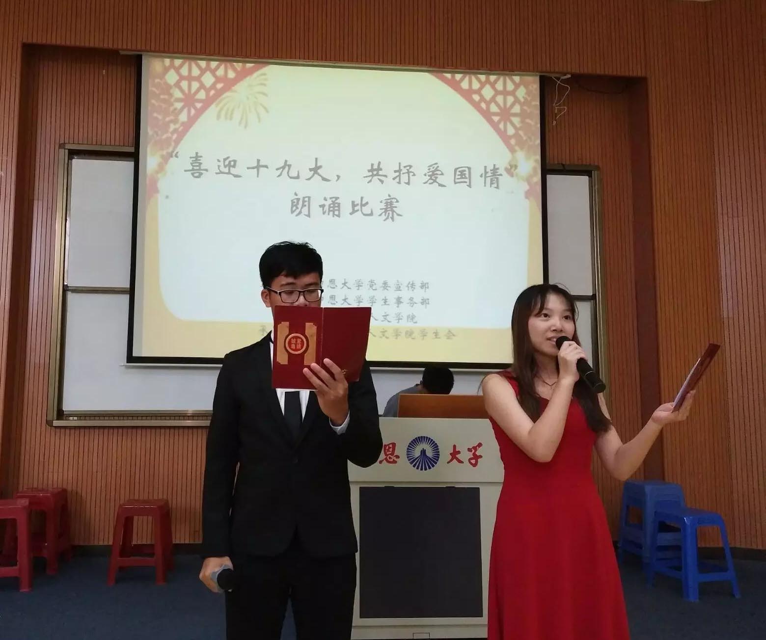 正值党的十九大召开之际,为营造十九大的喜庆氛围,抒发当代大学生的爱国情怀。beat365平台唯一官网于10月18日下午在第三教学区和昌楼惟勤讲堂举办“喜迎十九大,共抒爱国情”朗读比赛初赛。beat365平台唯一官网党总支书记胡友仁,辅导员李少聪、朱婷、刘巧玫,中文系教师李清霞、张彩英等出席了本次活动。