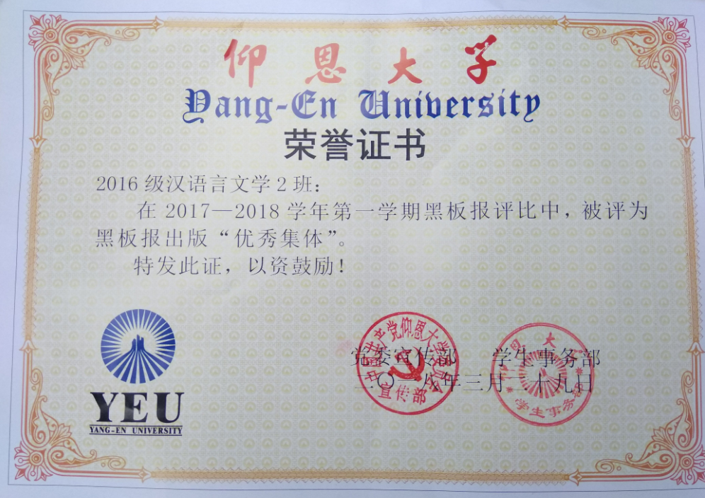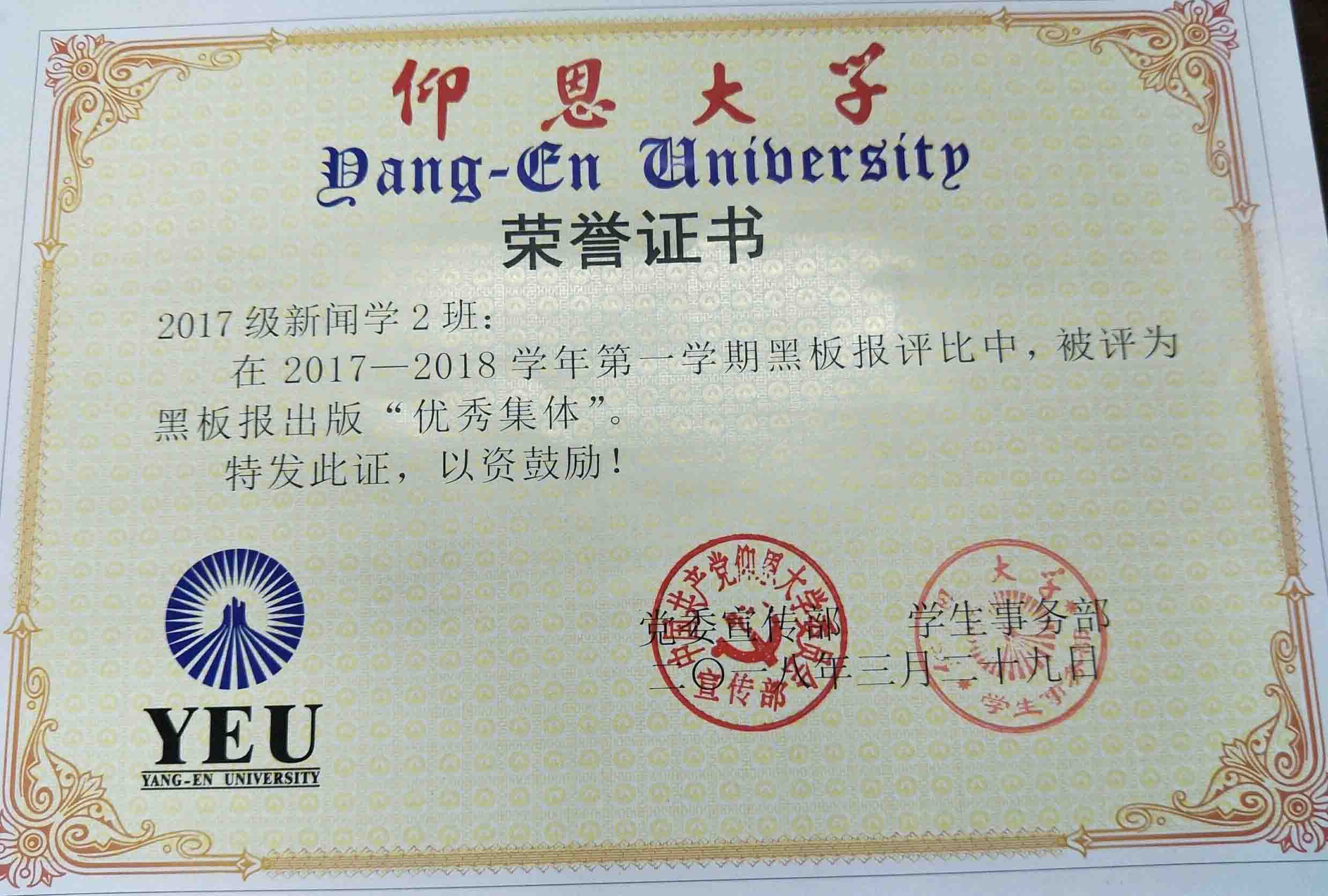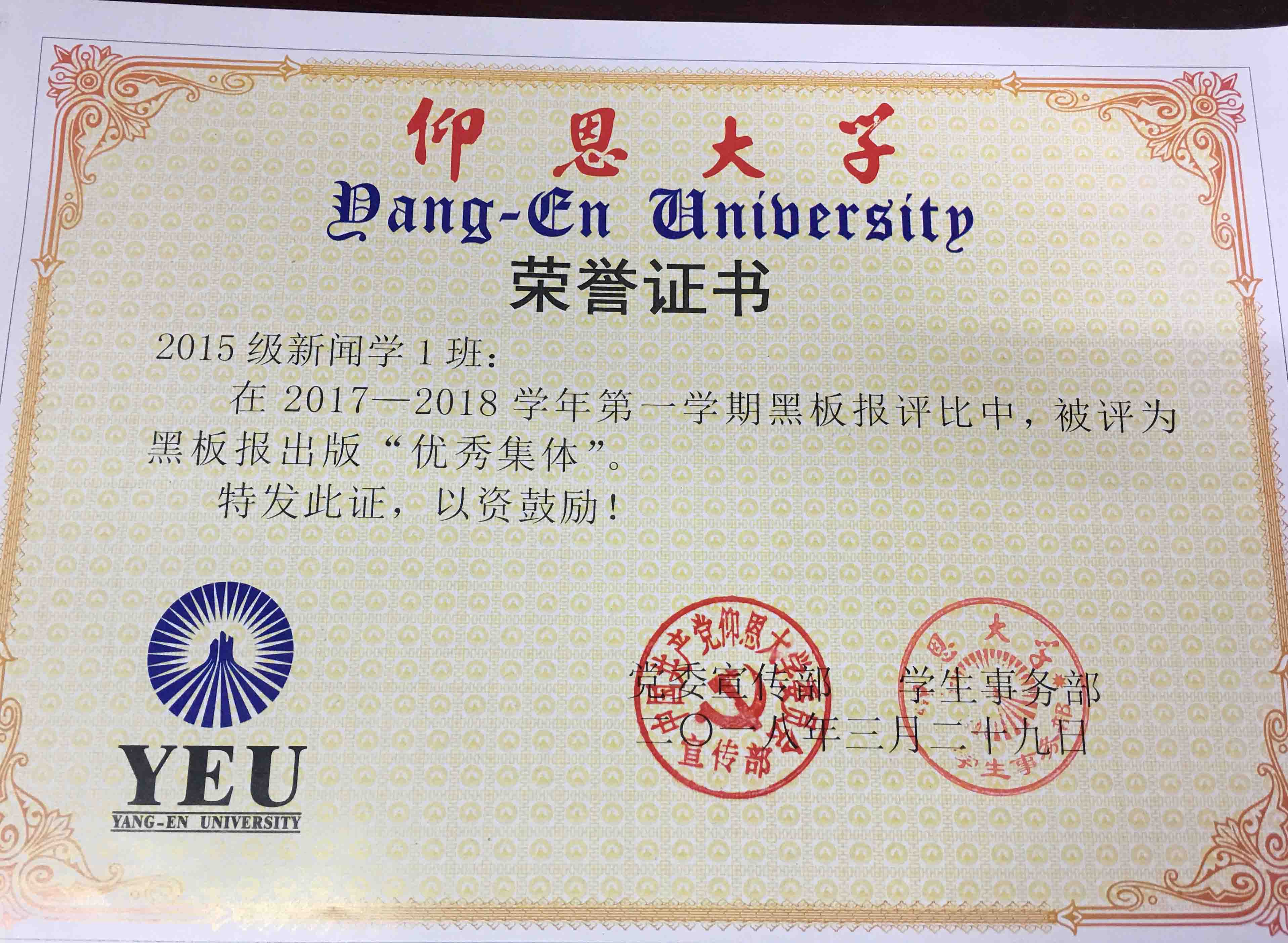 在2017—2018学年第一期黑板报评比中,beat365平台唯一官网有5个班级被评为黑板报出版“优秀集体”,他们分别是15新闻学1班、15汉语言文学2班、16汉语言文学1班、16汉语言文学2班、17新闻学1班、17新闻学2班、17广告学1班。