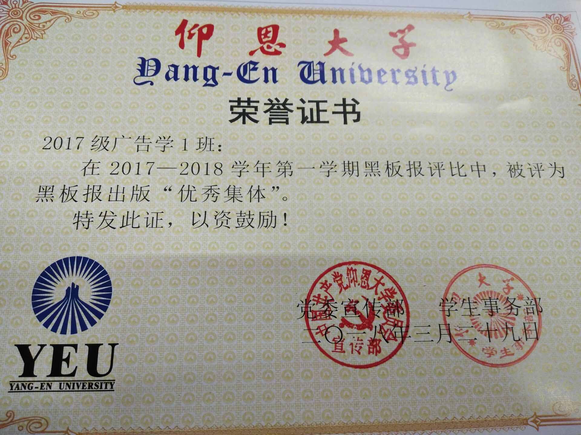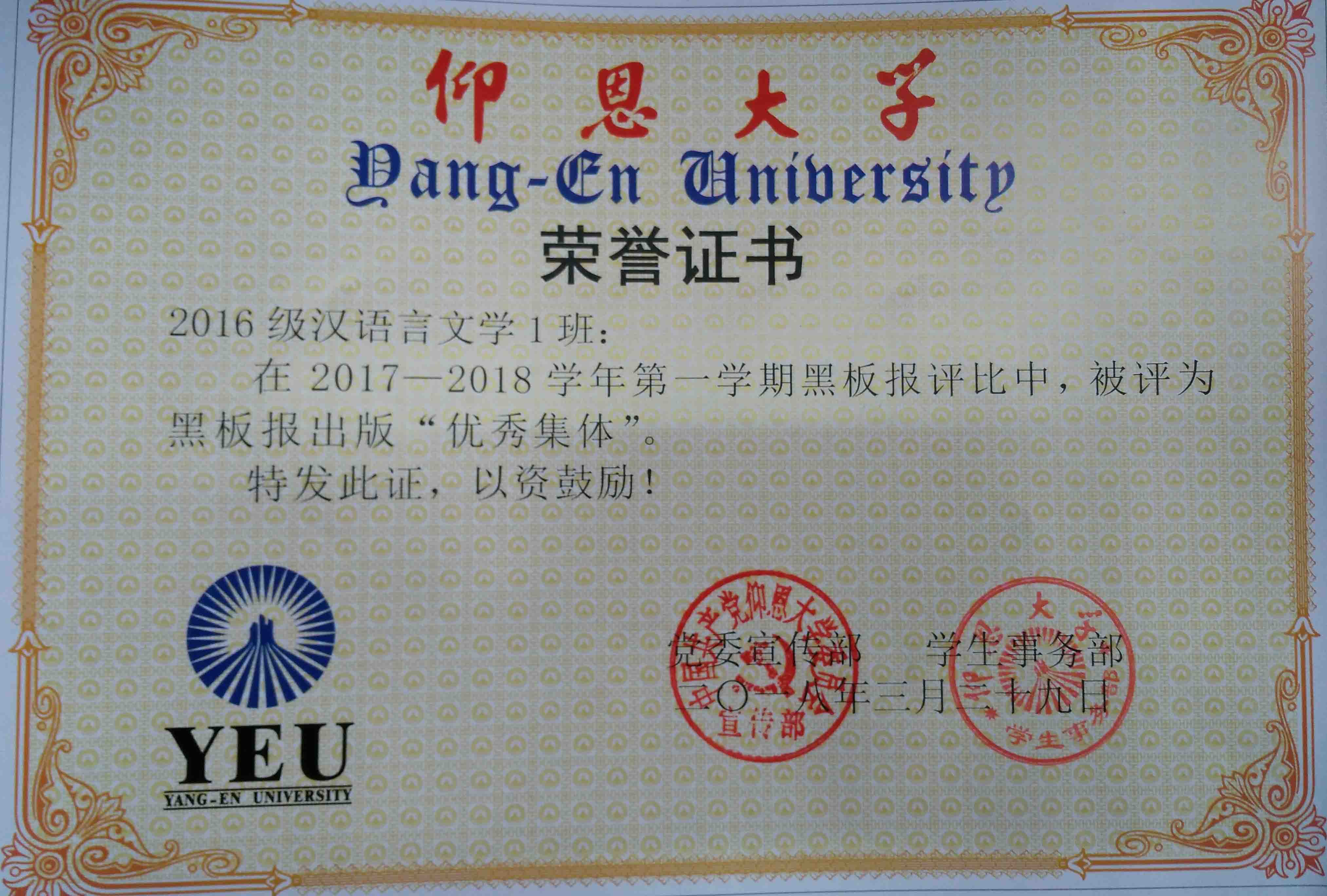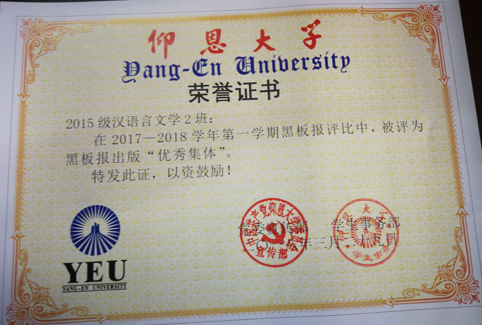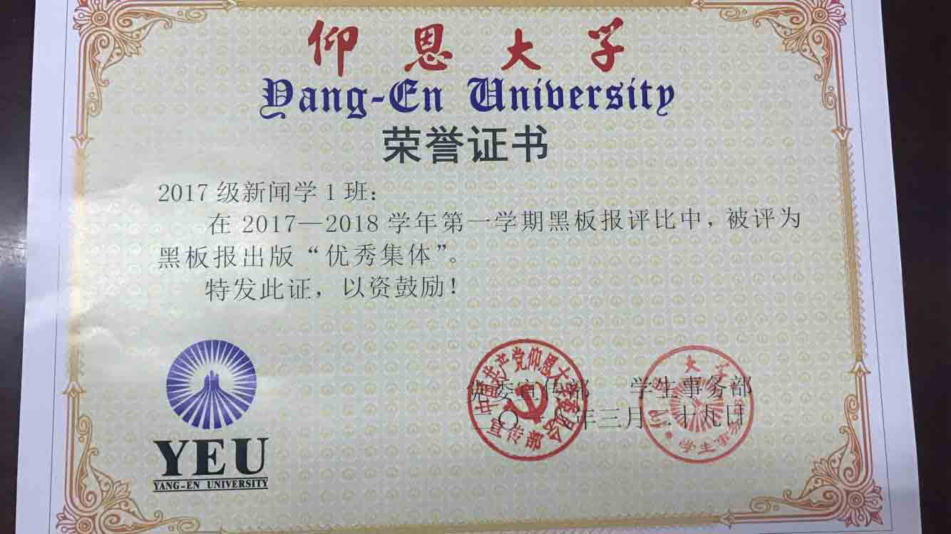 在2017—2018学年第一期黑板报评比中,beat365平台唯一官网有5个班级被评为黑板报出版“优秀集体”,他们分别是15新闻学1班、15汉语言文学2班、16汉语言文学1班、16汉语言文学2班、17新闻学1班、17新闻学2班、17广告学1班。