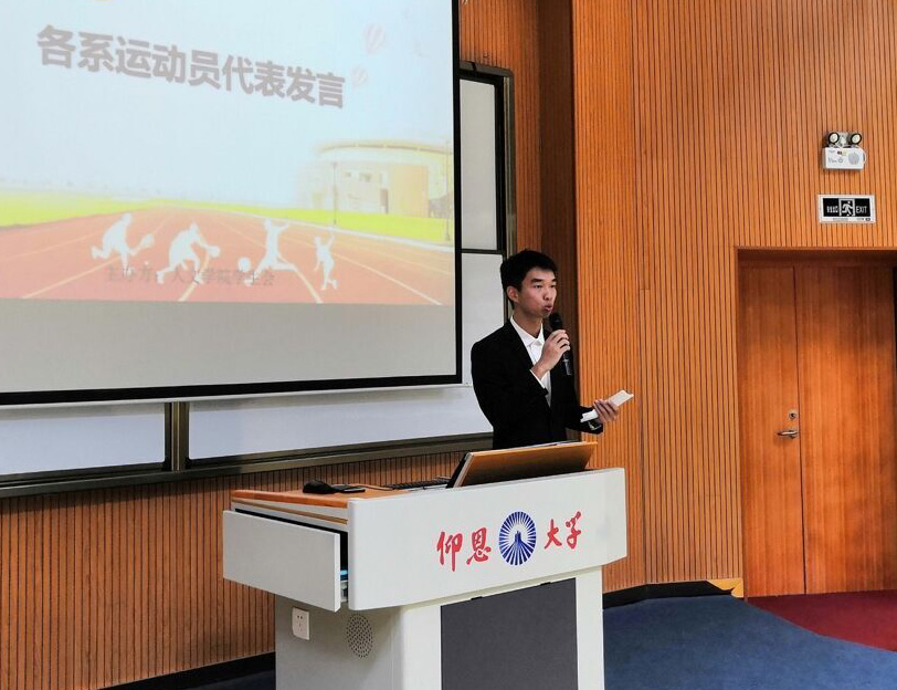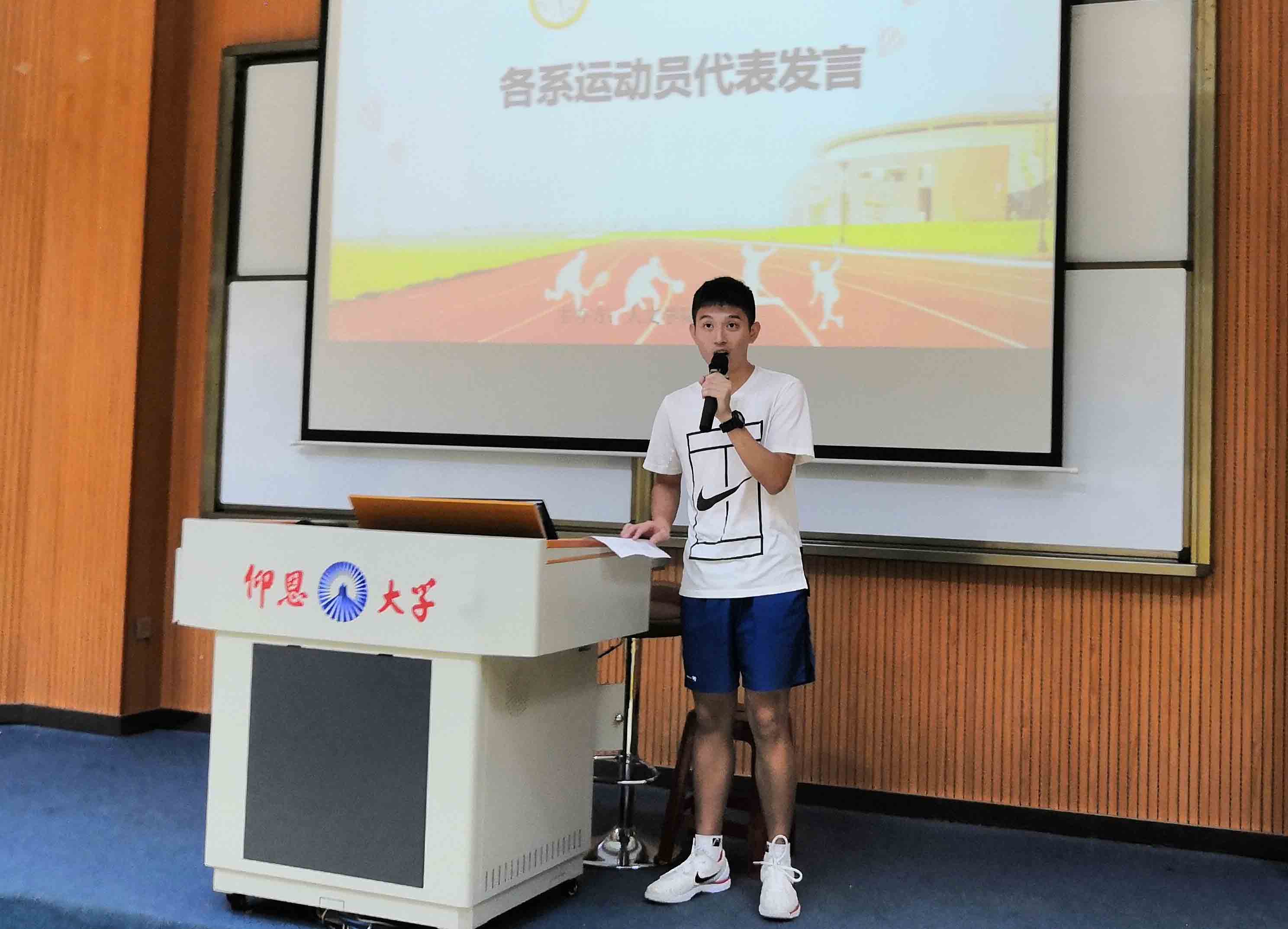 活动现场 在活动开始之际,大家观看了去年校运动会beat365平台唯一官网学生参赛的精彩照片和视频,感受校运动会的风采和魅力。学生会体育部代表张学凯同学率先发言,介绍了校运会的团体赛项目以及个人项目的比赛规则及注意事项。随后,各系运动员代表依次发言。中文系的范乾煜用慷慨激昂的语气鼓舞在场学生要有责任、有担当,为学院集体的荣誉奋勇拼搏。新闻系的朱方润从运动会对个人的益处角度出发,表示运动会是一个很好的挑战自我、锻炼自我的平台。广告系的曾陈生分享了自己参加足球赛,在第一场比赛失败之后,全体队员拧成一股绳,拼尽全力最终获胜的经历,呼吁同学们在运动会中“为自己而战,为学院而战”。