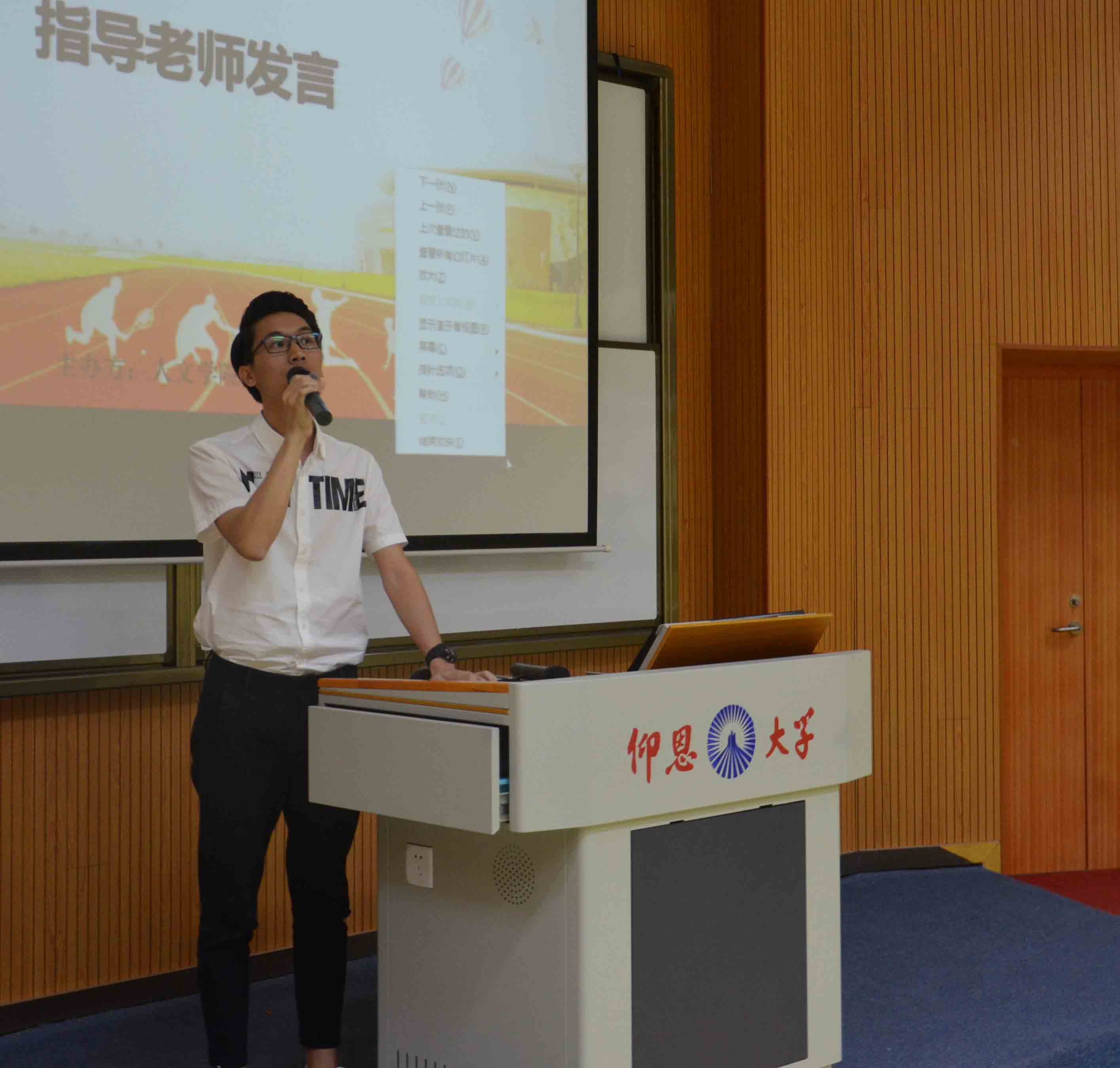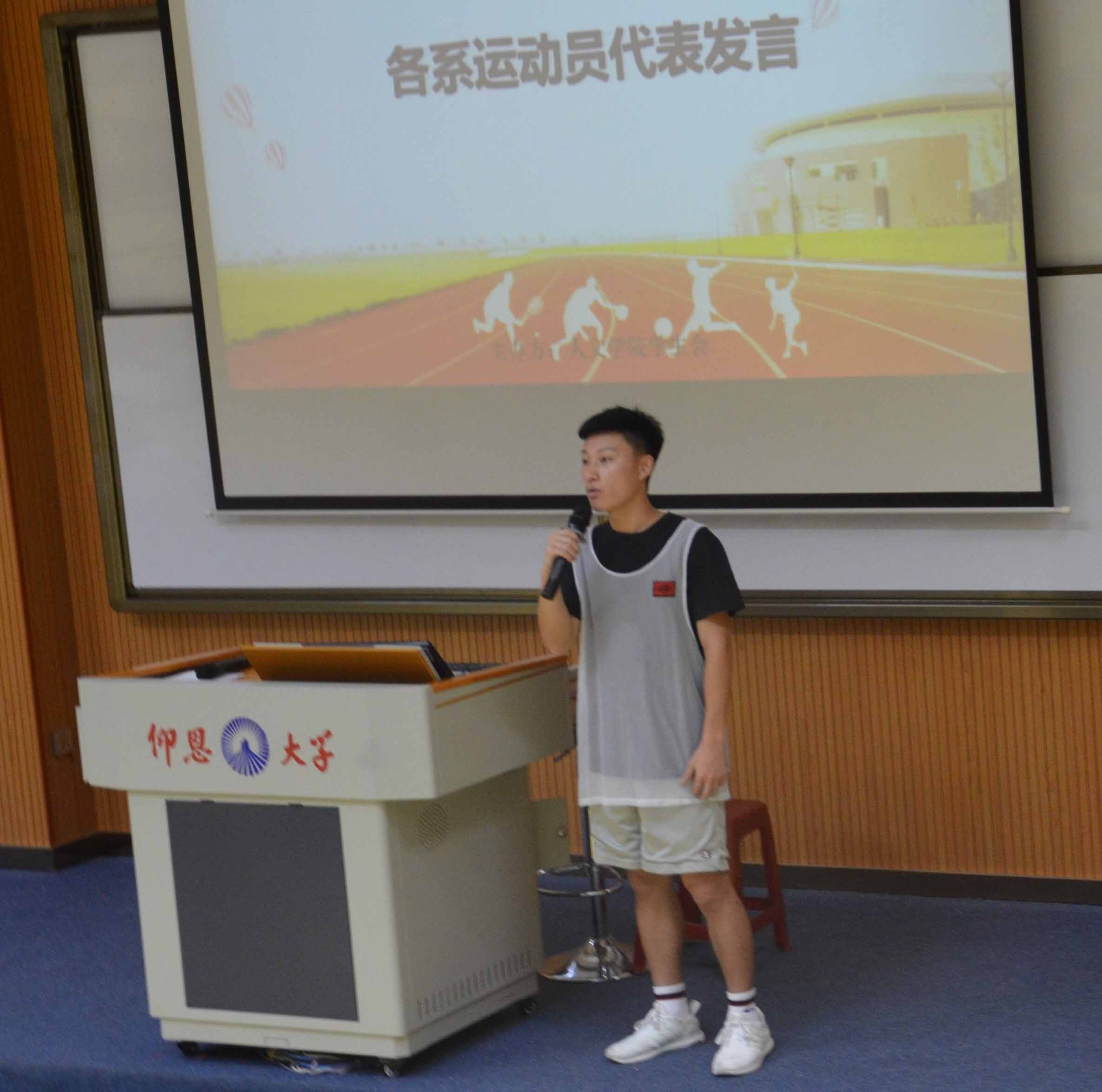 新闻系的运动员代表朱方润发言 李少聪老师提出运动会不仅是一次展现自我的很好机会,也是一次能够丰富自己的大学生活的美好经历,希望同学们能积极踊跃的参与到比赛中去。同时李少聪老师也对本次运动会的相关比赛事项宜做了了具体的安排。
