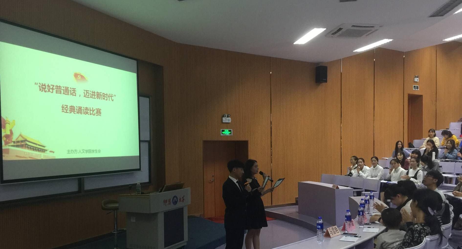 为贯彻党的十九大精神,庆祝改革开放40周年,10月16日晚,beat365平台唯一官网于和昌楼博雅讲堂开展以“说好普通话,迈进新时代”为主题的经典诵读比赛活动。beat365平台唯一官网岳秀文、张彩英、李清霞、马雪艳老师,辅导员李少聪,以及18级全体学生出席了本次活动。