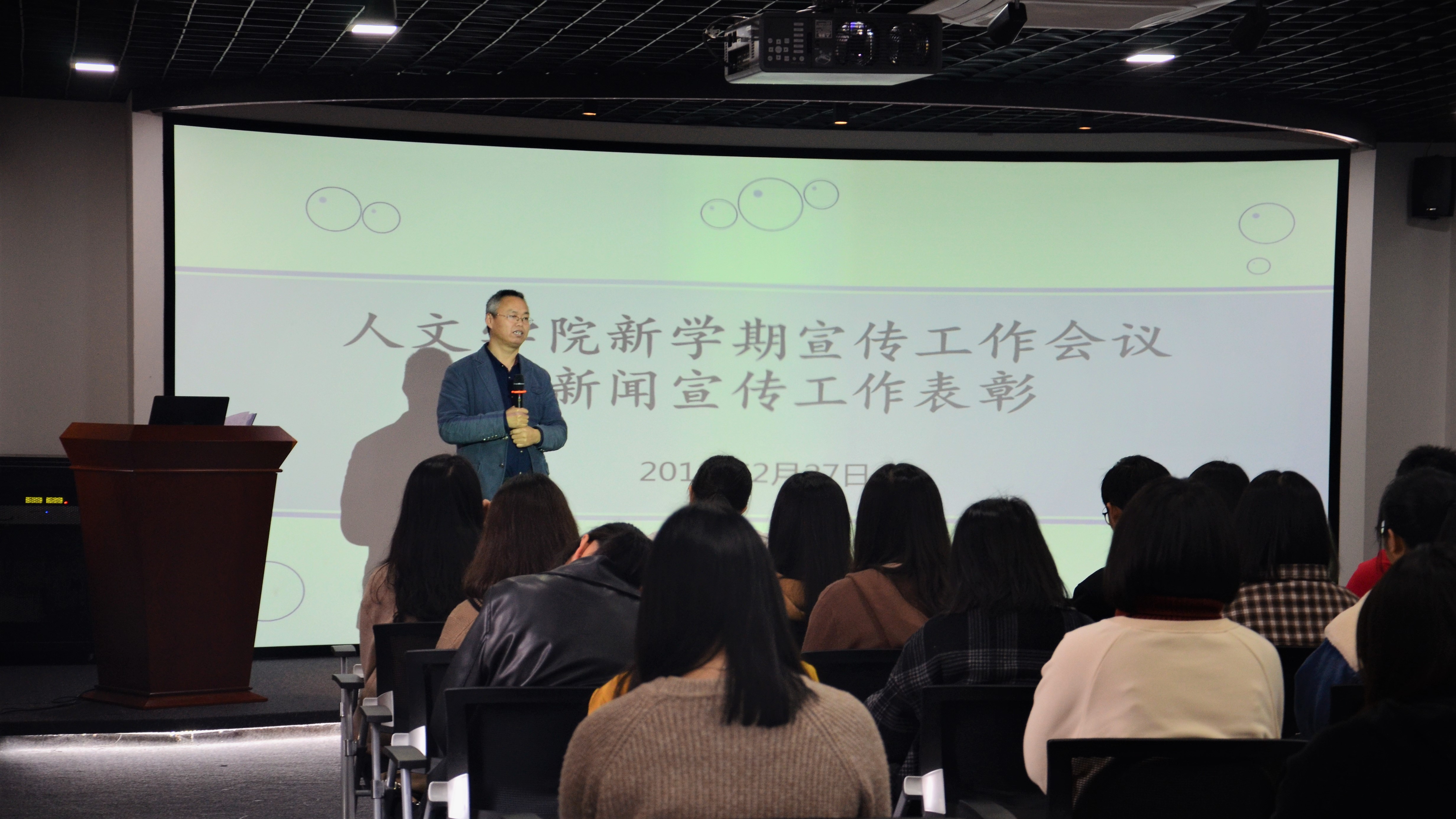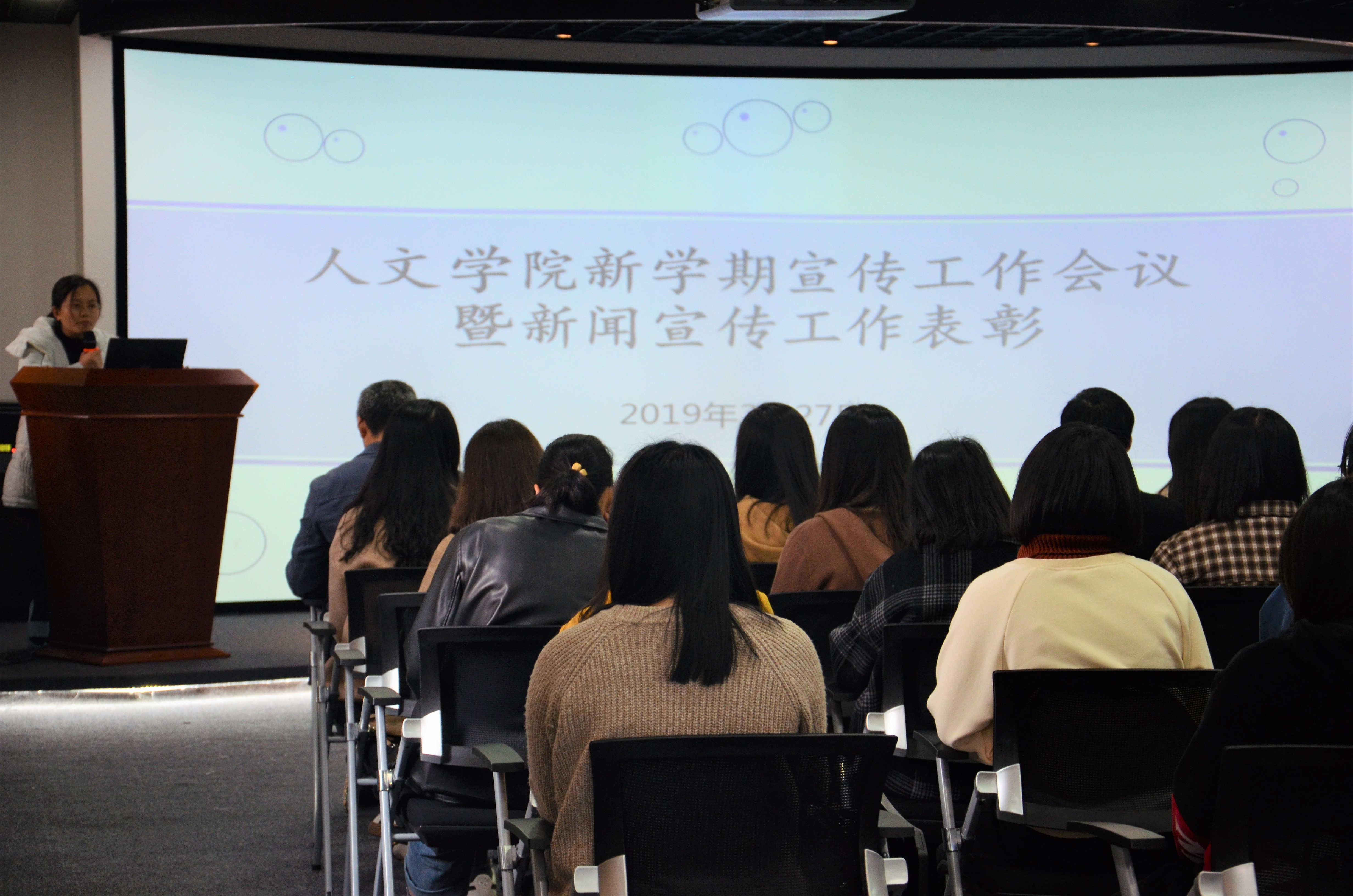 2月27日下午,beat365平台唯一官网新学期宣传工作会议暨新闻宣传工作表彰大会在普照楼虚拟仿真实验室召开。beat365平台唯一官网党总支书记兼副院长胡友仁、副书记刘巧玫、全院各班级宣传委员、团委、学生会宣传部门以及新媒体团队成员受邀参加本次大会。
