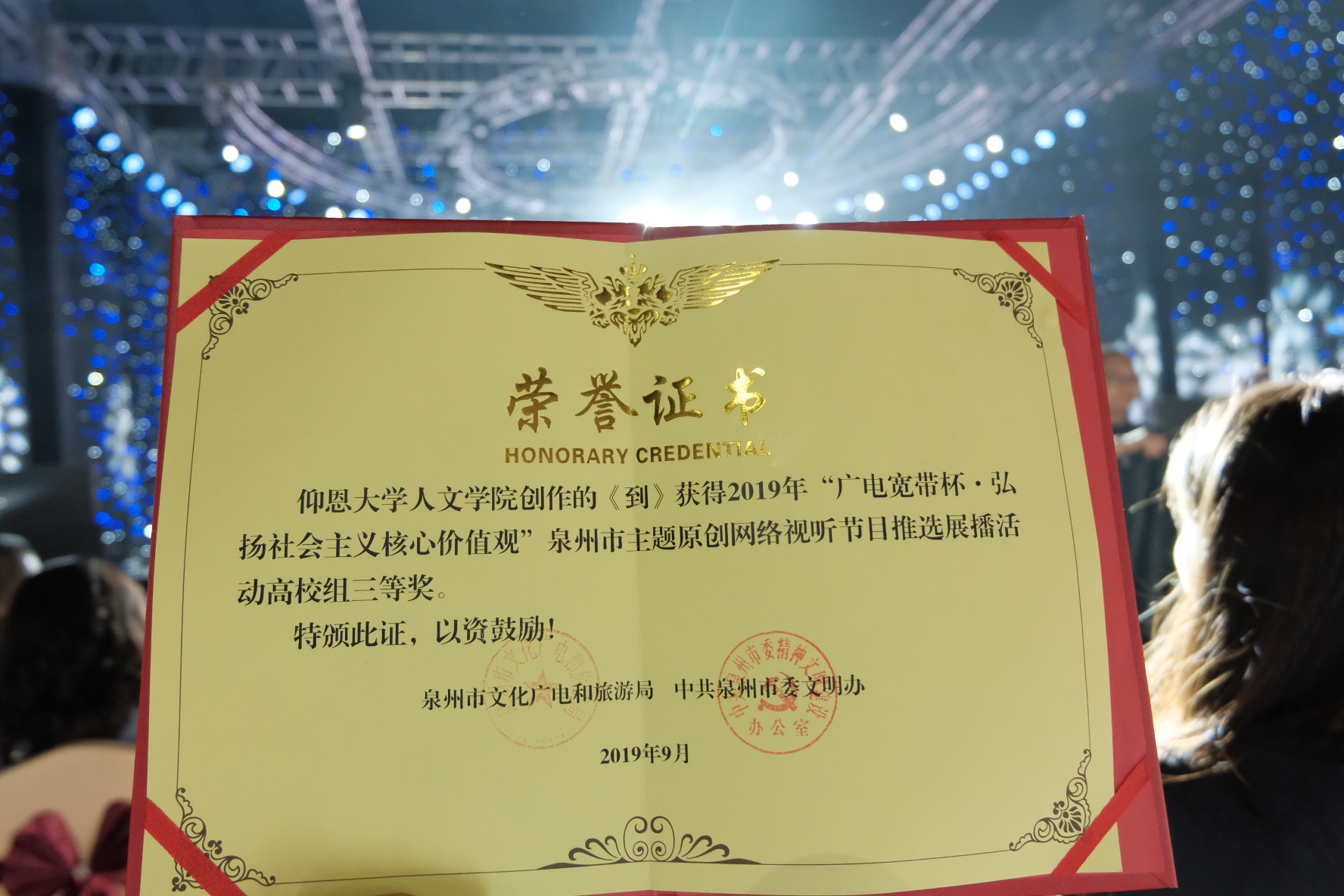 12月26日下午,beat365平台唯一官网和电视台选送的原创作品《到》《传城人》在2019年“广电宽带杯·弘扬社会主义核心价值观”泉州市主题原创网络视听节目推选展播活动中荣获高校组三等奖。