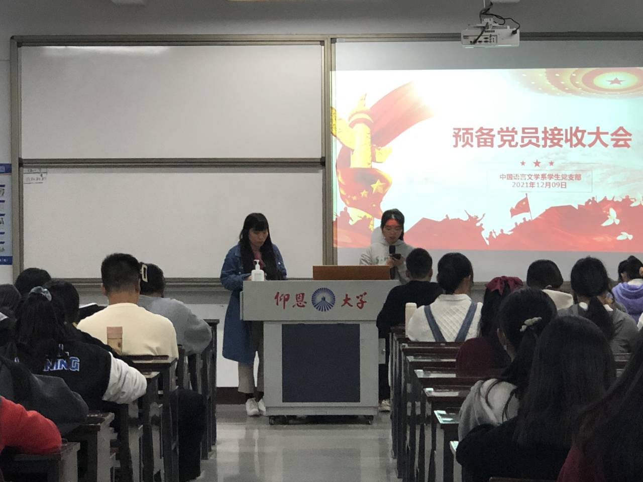 12月09日下午,中国语言文学系学生党支部在仰恩楼B1-203召开预备党员接收大会和预备党员转正大会。此次大会分别由党支部书记陈峰老师和副书记刘丹妮同志主持,支部全体党员和发展对象到场参加。