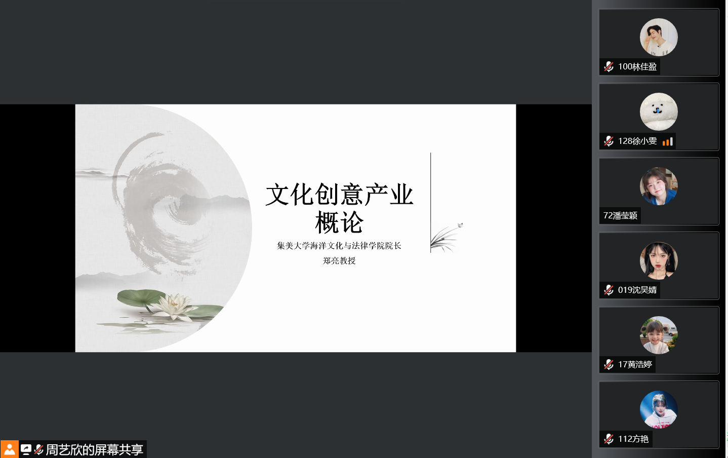 为丰富学生的知识储备,提高技能水平,进一步认识和学习文化创意产业,3月30日晚,beat365特别邀请福建海洋文化与创意产业研究基地主任——郑亮,为beat365中文学子带来了文化创意产业概论课程。受疫情影响,此次课程于线上展开。文化创意产业是在经济全球化背景下产生的以创造力为核心的新兴产业,其本质就是一种“创意经济”。郑亮教授将自己多年的工作经验与本次课程相联系,让同学们对文化创意产业有了更深的了解。