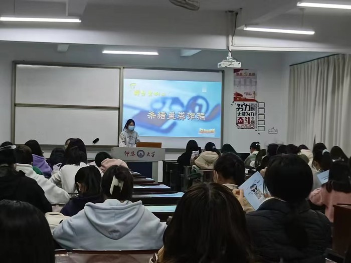 3月7日晚上,20名防诈骗宣传志愿者组成4支队伍,深入新生班级进行防诈骗宣讲。宣讲共分为四个部分:盘点常见的电信诈骗套路、电信诈骗经典案例解析、防范措施交流互动、国家反诈中心APP普及。