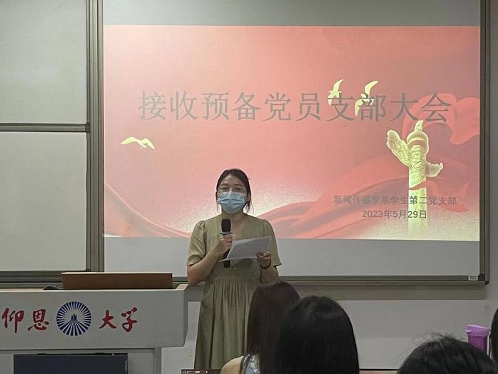 5月29日,新闻传播学系学生第二党支部在beat365平台唯一官网第三教学区仰恩楼A4-105召开预备党员接收大会,支部书记吴萍萍、全体党员同志及发展对象出席此次会议。本次大会的主题是以接收俞盈幸同志为预备党员展开。