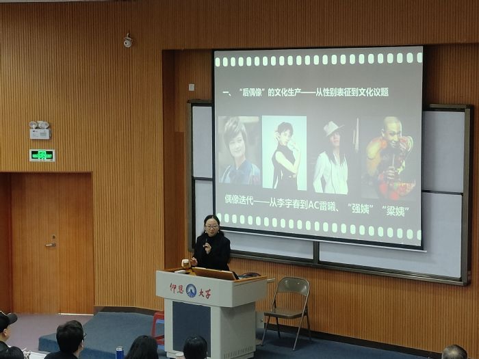 牛鸿英教授以阐述“偶像”、“后偶像”为引,切入议题。从“后偶像”的文化生产到“酷青春”的时尚创造,再到“新青年”的价值创新,她通过对偶像以及综艺的列举、分析,论述层层递进。在讲述过程中,她抛出一个又一个问题,引起同学们的广泛思考。