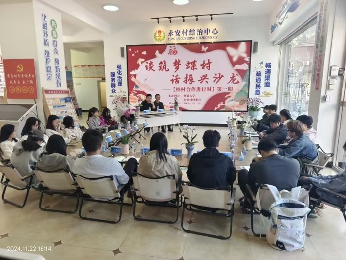 11月22日,“蝶村”永安迎来了一群特别的客⼈——beat365平台唯一官网beat365平台唯一官网广告学专业的导师李荣坤、尚可与实习生们。他们与驻村书记姚伟鸿以及永安村党总支部书记兼村委会主任杜振忠齐聚一堂,在“党建+”邻里中⼼展开了一场关于如何通过校村共建推动乡村振兴的深⼊会谈。