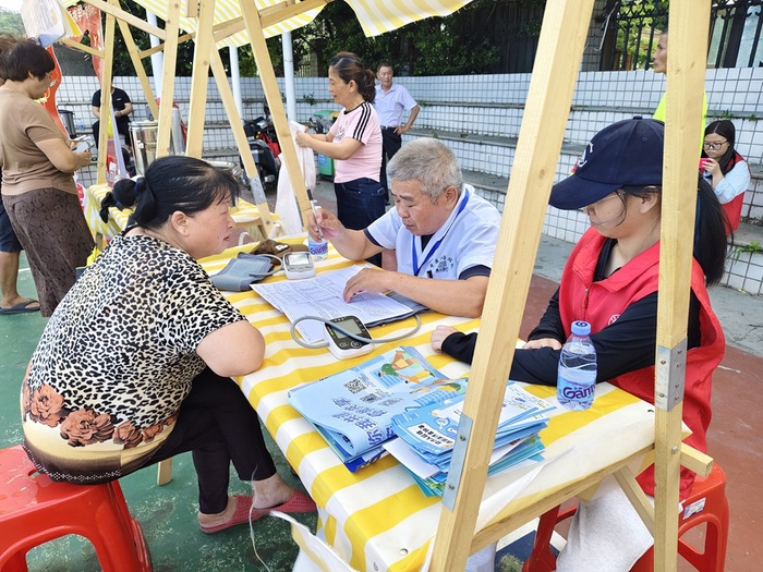 活动由多部门协同开展,队内成员身着醒目服装在现场参与且分工明确。队员们不仅积极地在民俗文化园备消暑饮品及时补足后勤物资,还亲自参与体验棉花糖制作,协助医护人员量血压、记数据,结合建议讲保健知识同时,队员们还借问答游戏、道具演示等为居民们普及垃圾分类等生活常识。