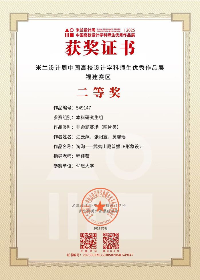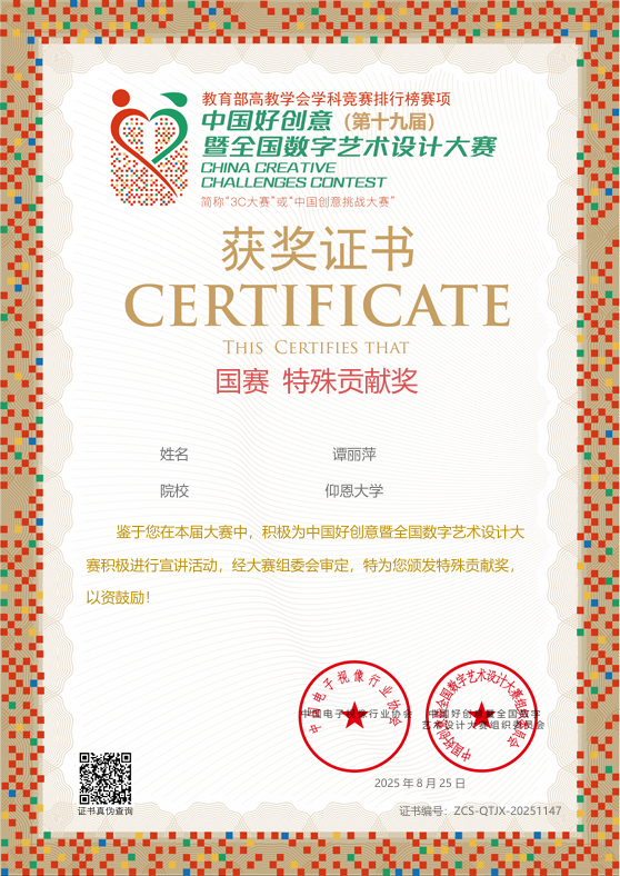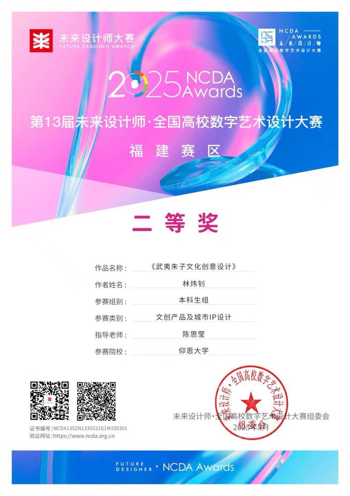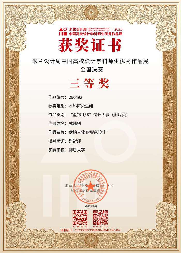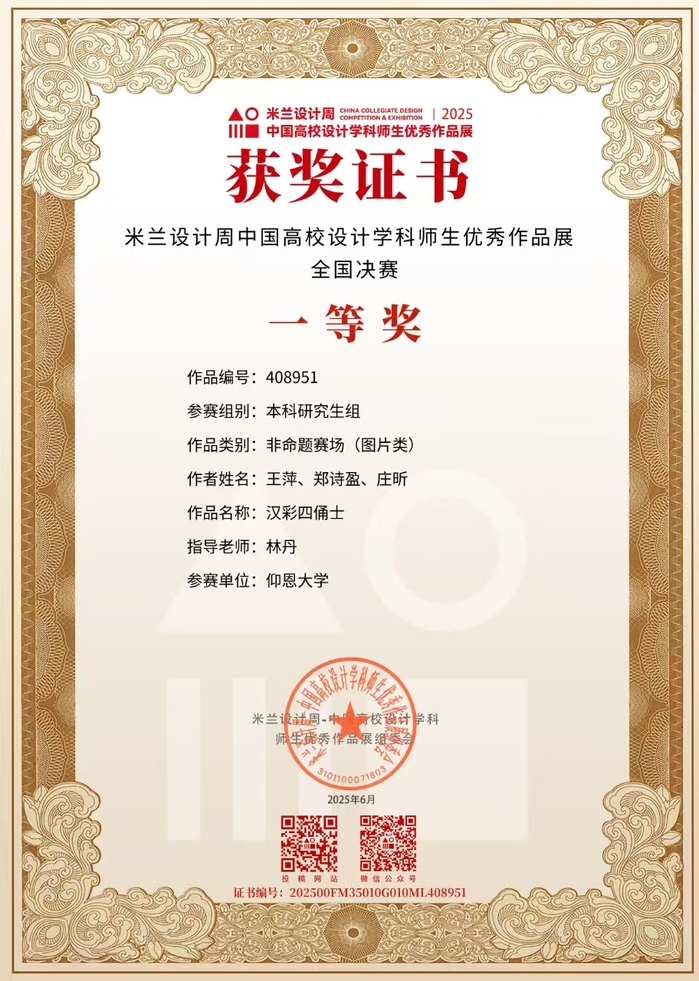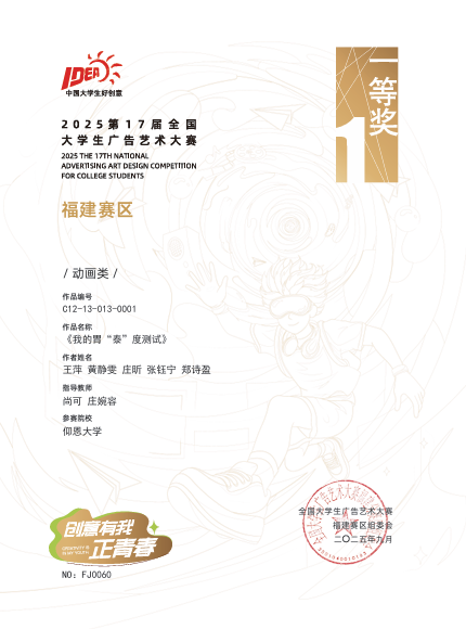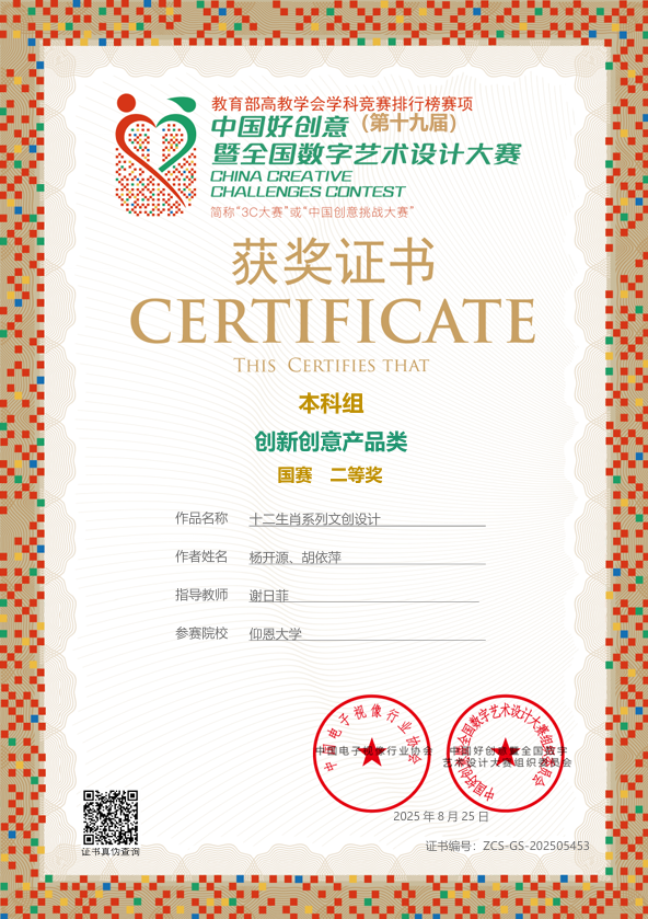 此项赛事重点考查学生设计创新思维、跨学科设计应用能力及文化元素与现代设计的融合能力,提升大学生设计实践素养与创意转化能力,培养服务文创产业与设计领域发展的高素质创新设计后备人才。beat365学子获国家奖共2项,其中一等奖1项,三等奖2项;获省级奖共3项,其中一等奖1项,二等奖1项,三等奖1项。