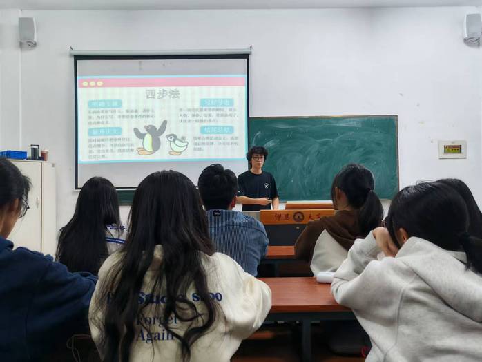 采写部部长吴伊从新闻的定义与特点入手,系统阐述了新闻写作的基本结构。她结合自身丰富的采写经验,深入浅出地分享了新闻稿的撰写技巧与常见误区,帮助新干事们快速构建起对新闻写作的专业认知。