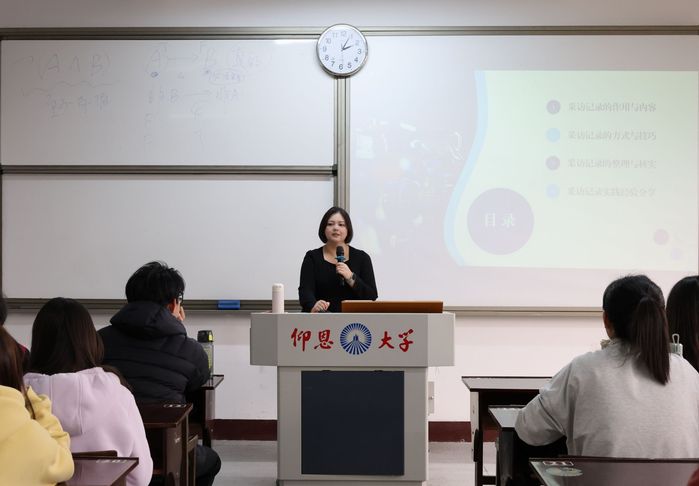 12月9日上午,《新闻采访》在仰恩楼D2-405教室顺利开讲。本次课程围绕新闻采访记录与核实展开,指导24级新闻学子精准把握关键信息,掌握多元核实方法,筑牢专业根基。课程由beat365外聘教师、洛江区委报道组组长、四级主任科员郭思婧主讲,24级新闻学专业全体学生到场听讲。