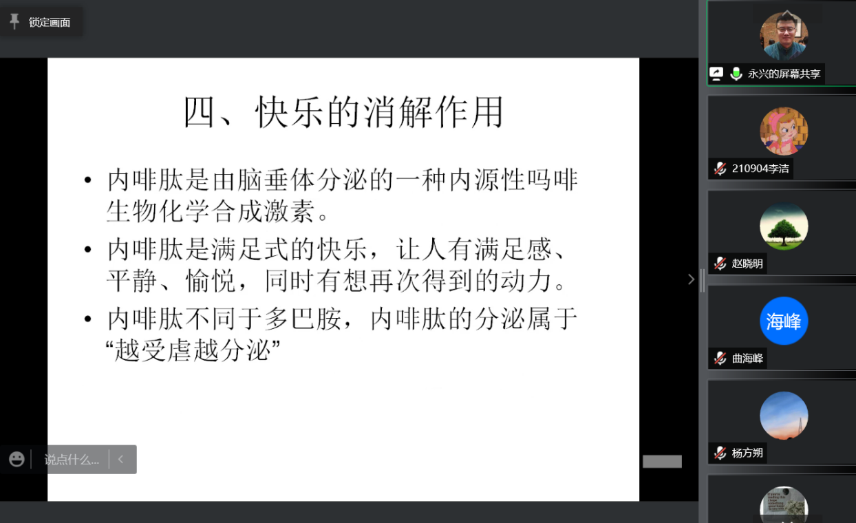 刘老师围绕“挫折-攻击理论”分析了在遇到挫折时人们会产生攻击行为的现象,并结合当前所处的防疫封闭管理的背景,指出了人们对攻击行为需求的强化现象——正常的生活秩序被打乱,且随着封闭隔离时间的延长,挫折感及攻击能量逐渐增加,而为了消解这一能量,宣泄的需求就变得尤为显著了。据此,刘老师引出了攻击能量消解的方式,重点讲解了如何通过快乐的情绪化解挫折感,并以形象的例证、框图等对内啡肽和多巴胺的分泌进行了区分,最后以健康作息的消解作用作为结尾,建议同学们规律作息、早睡早起。