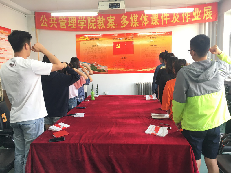 最后,面对鲜红的党旗,全体新发展预备党员在领誓人张宇航同学的带领下,庄严地举起右拳,郑重宣誓,重温了入党誓词。