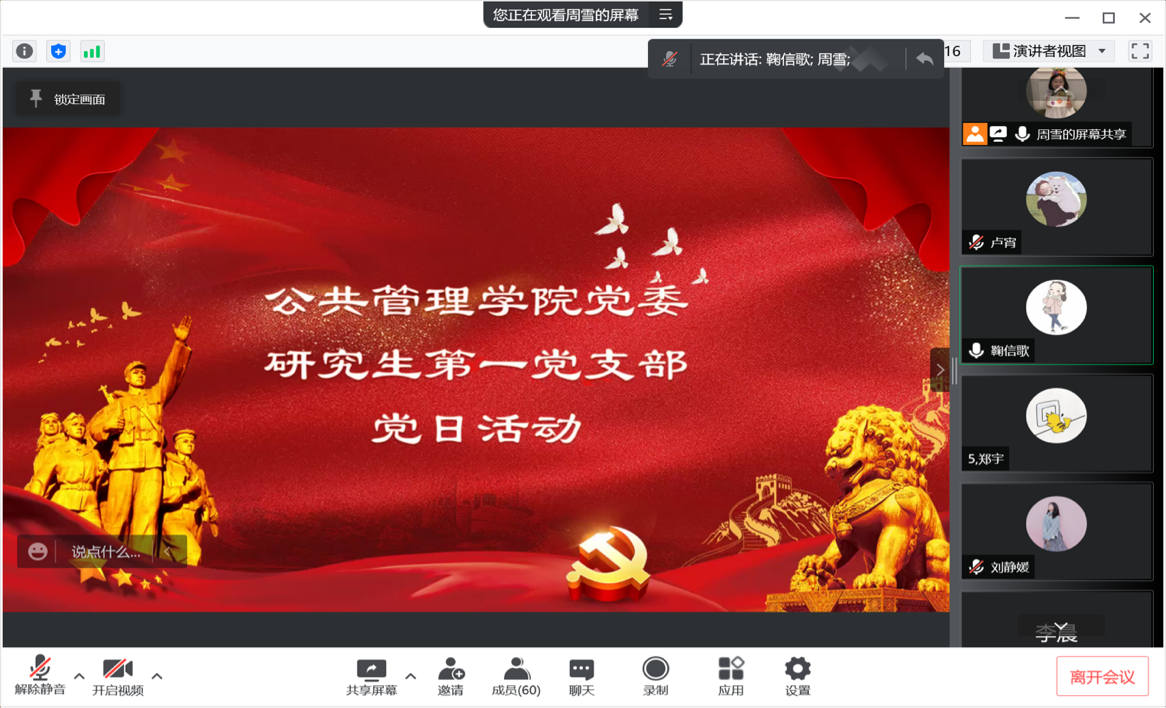 接下来,公共管理学院研究生第一党支部书记鞠信歌老师询问了支部党员们身处不同地区的防疫现状,党员们踊跃发言:聂辛哲同学分享了自己在抗疫重地吉林市九台区积极配合政府工作采用网格方式配送物资的防疫事迹;周雪同学代表在校同学们阐述了封校后在党中央的正确领导以及吉林省委的正确部署下,校领导、老师以及志愿者们的辛苦付出,学校防