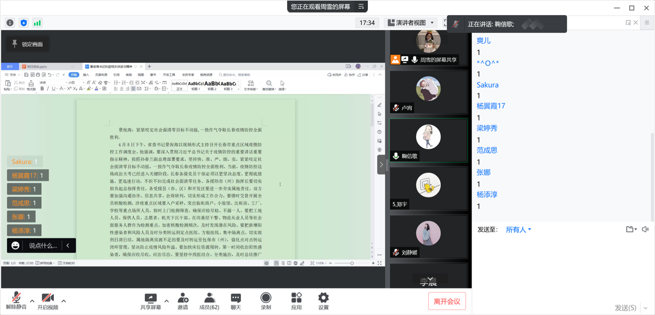 在鞠信歌老师的主持下,会议伊始,由周雪、姜秀璇和李晨三位同学宣读景俊海书记抗疫相关讲话,支部党员们认真听取并学习。