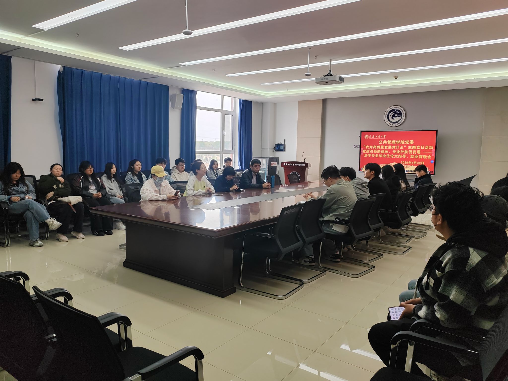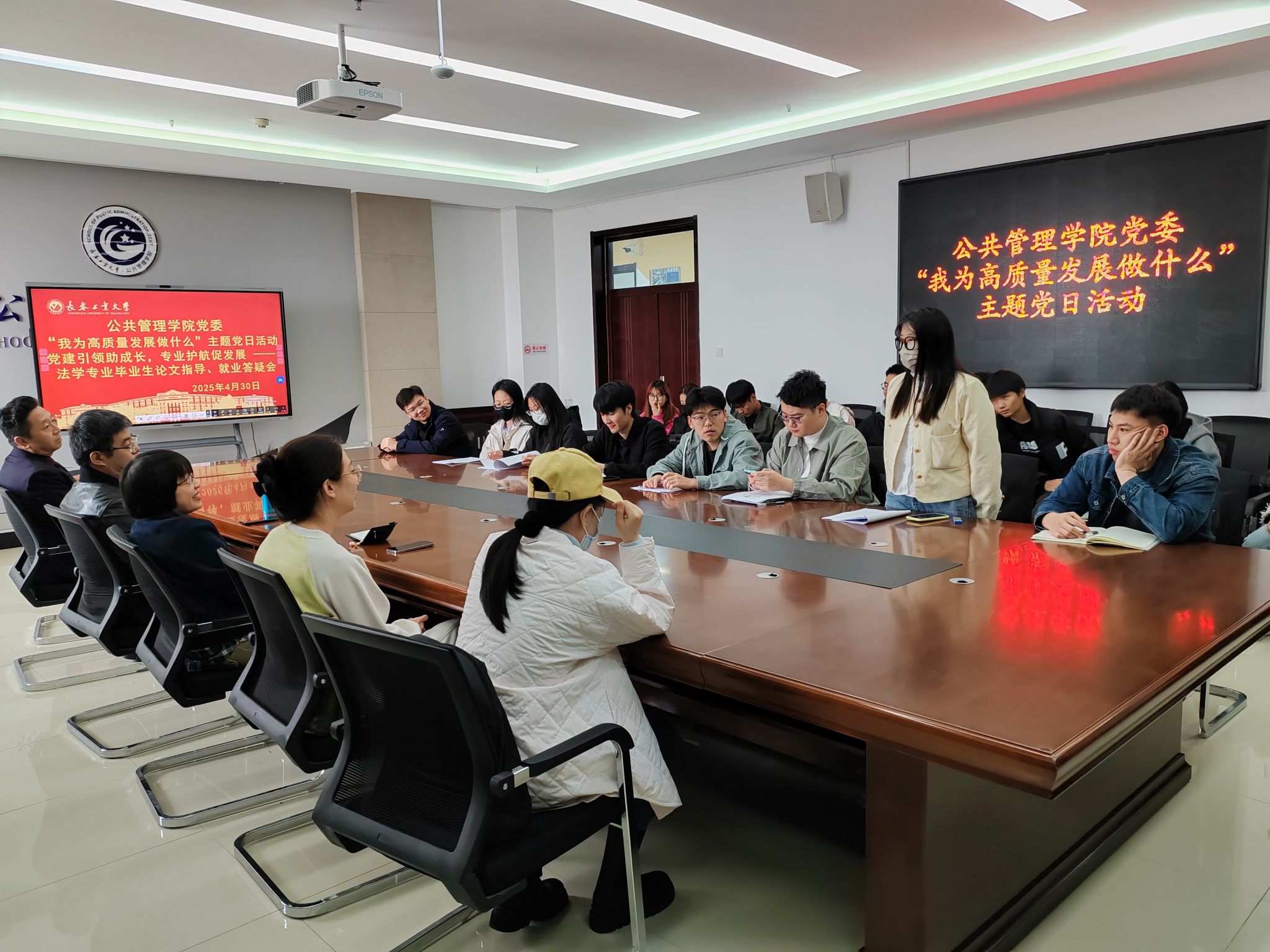 (通讯员:崔元慧)2025年4月30日,公共管理学院党委紧扣“我为高质量发展做什么”主题,组织法学系党支部在北湖东区401会议室开展法学专业毕业生论文指导与就业答疑会。学院副院长冯娜、法学系党支部书记郭千钰、系主任宋浩及党员教师代表张雪峰、刘备,与法学专业本、研究生毕业生代表面对面交流,围绕毕业论文指导、就业政策解读等热点问题展开深度研讨,以实际行动践行党建与专业建设双融双促。