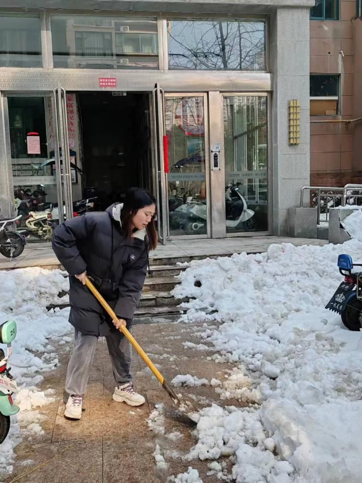 我是公共管理学院210904班的李洁。这个寒假,我积极响应学院号召,在河南省固始县湖畔春天社区进行大学生“返家乡”实践。在岗期间,我积极配合社区工作,加入到社区铲雪的劳动中,帮忙清理单元楼前和车道上的积雪和暗冰,以免社区居民摔倒和车辆打滑,确保居民安全、温暖过冬。此外,我还在社区文明实践站整理社区年度材料,撰写总结报告,为社区建设献一份力