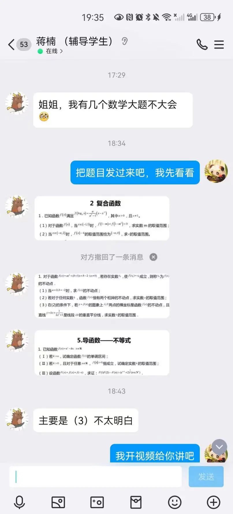 感谢学院提供的平台和机会,我很荣幸能与蒋楠同学成为学伴,参与“学伴+”志愿服务活动。我们通过线上视频、微信聊天等方法进行作业讲解。在讲解的过程当中也发现了许多的学习上的问题,我会与她本人沟通并及时解决。经过这一段时间的学习,蒋楠同学对知识的掌握更加扎实。