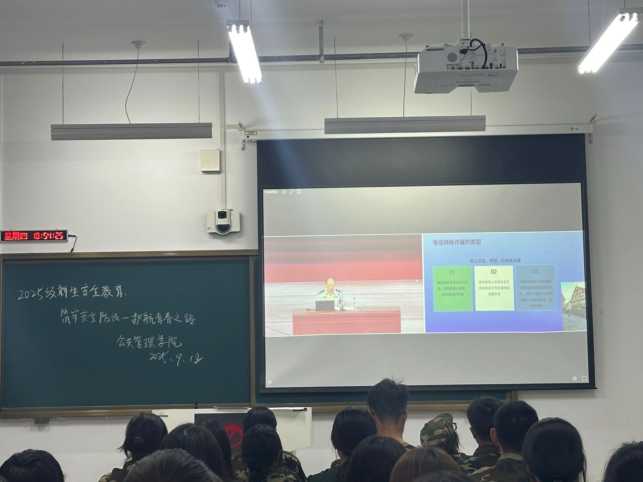 为增强同学们的安全防范意识和自我保护能力,有效保障同学们的人身与财产安全,进一步推进建设平安校园。公共管理学院于9月18日在北湖东区主楼205教室组织开展25级新生安全教育专题学习活动,通过观看讲座,增强同学们的安全意识。