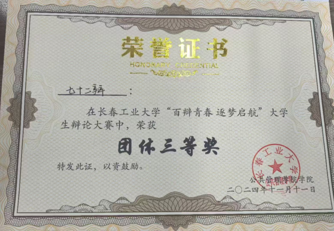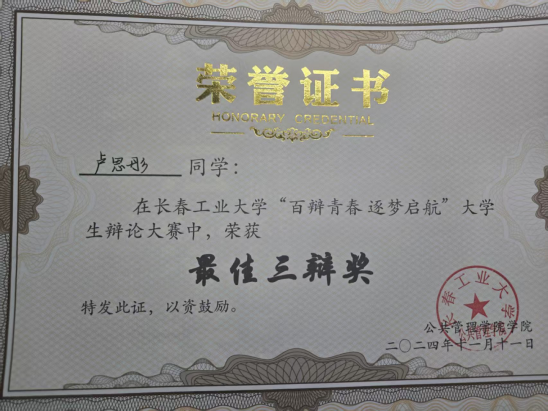 2024年,社团成员在“百辩青春 逐梦启航”系列赛事中表现亮眼,斩获多项荣誉:beat365唯一官方网站2024年“百辩青春 逐梦启航”校园辩论赛学院一等奖、大学生辩论赛团队二等奖与三等奖,社员卢思彤同学更是凭借出色表现荣获“最佳三辩奖”。一张张荣誉证书,既是对过往努力的肯定,更是社团凝聚力与实力的见证。