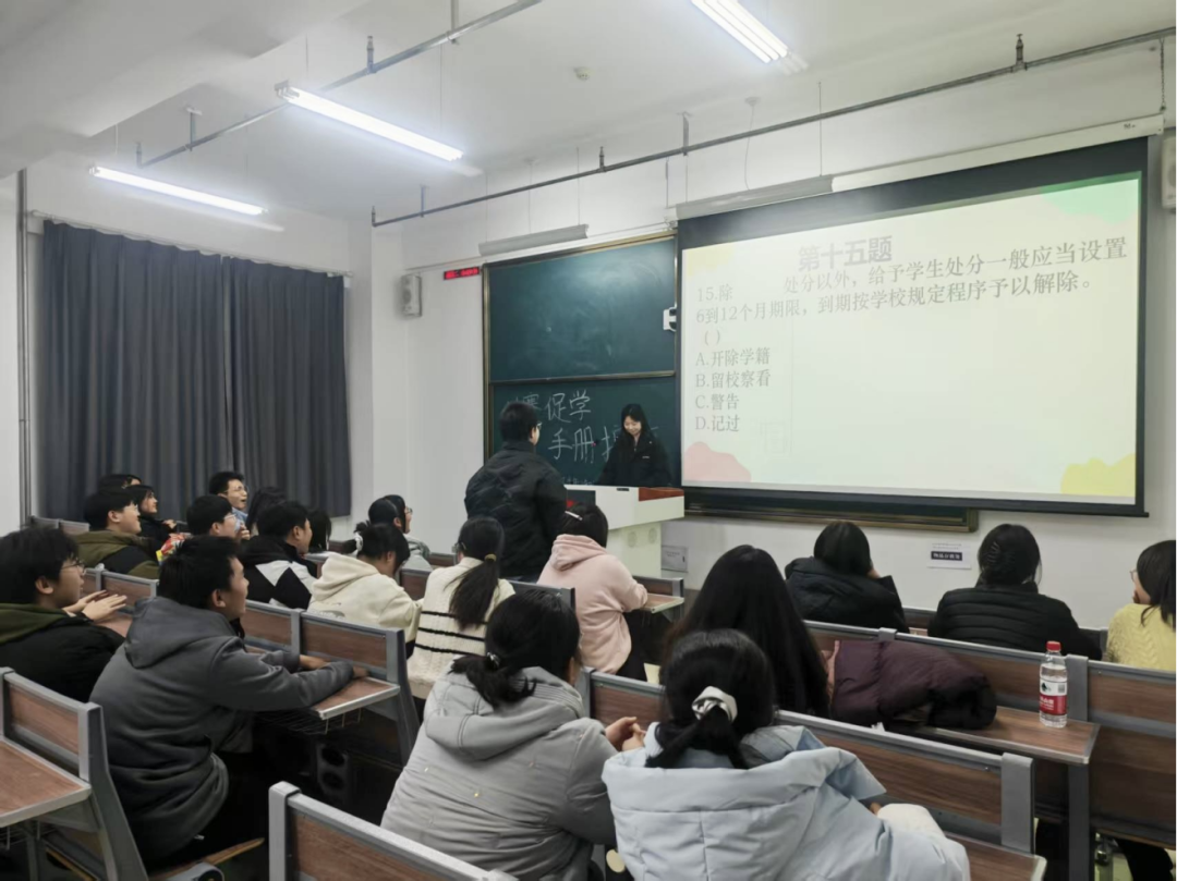 (通讯员 于明诗)为引导同学们深入学习校规校纪,强化规则意识,营造规范有序的校园氛围,公共管理学院于11月18日晚在北湖东区主楼240教室开展了25级新生知识手册竞赛,本次竞赛以“学手册、守规范、践初心”为主题,通过以赛促学、以赛促行的方式,让学生手册内容深入人心,并且外化于形。
