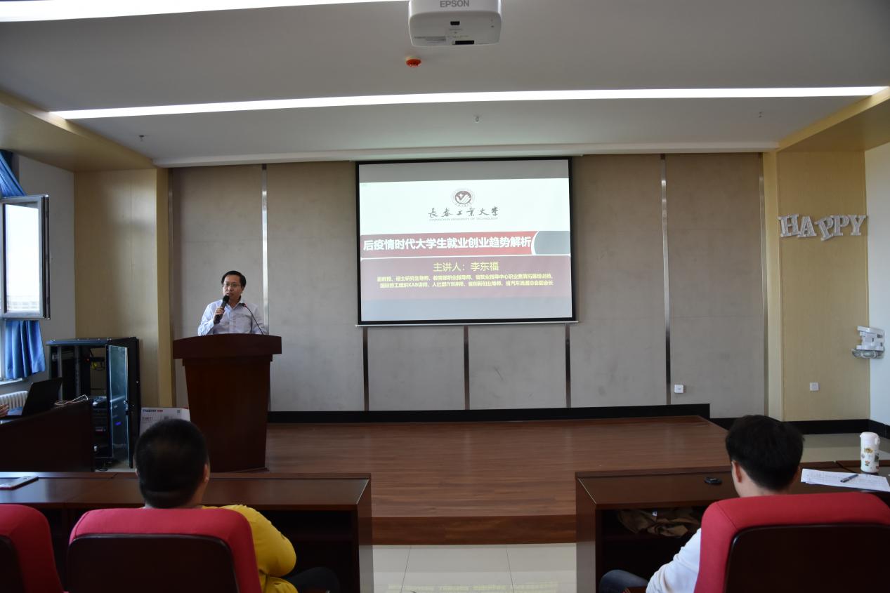 李东福老师为同学们系统全面地分析了后疫情时代的就业形势。李老师告诫同学们要对自身有一个准确的定位,确定好自己的第一选择。