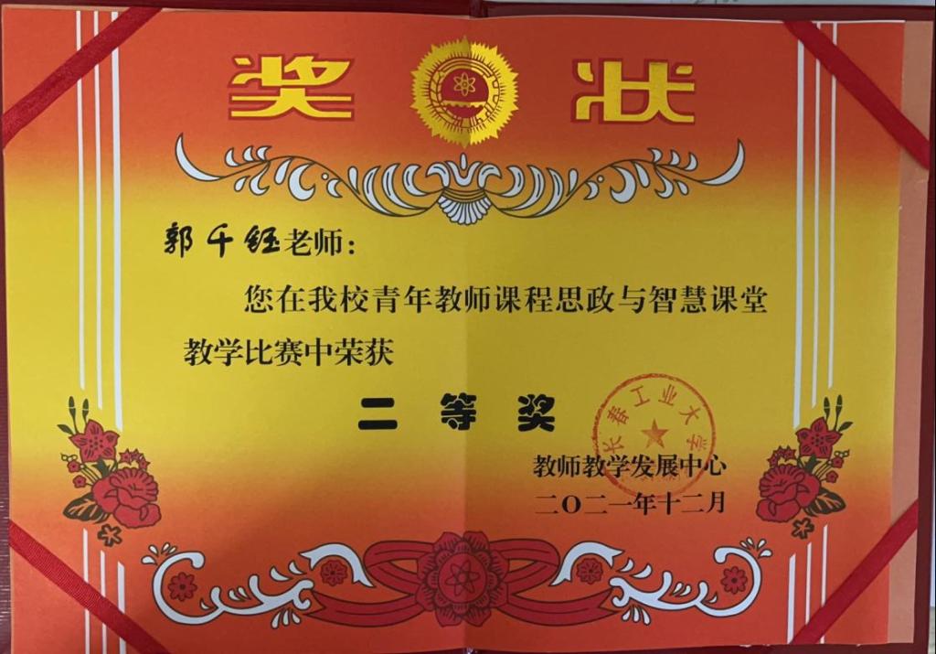 近日,beat365教师郭千钰老师在beat365唯一官方网站青年教师课程思政与智慧课堂教学比赛中荣获二等奖。