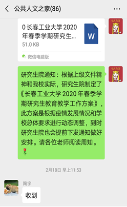 最后,各学科负责人汇报了各系研究生课程线上教学安排的进展情况。比对学校提供的各类线上教学平台,授课教师均已选择并安装了适用的平台软件,积极参加了各平台微信群的网络教学培训,认真学习了操作流程文件,目前正处于模拟适用阶段。各学科负责人表示对学校、学院下发的文件教师均积极响应,并认真贯彻落实,一定高质量完成研究生教育教学工作的各项安排要求。