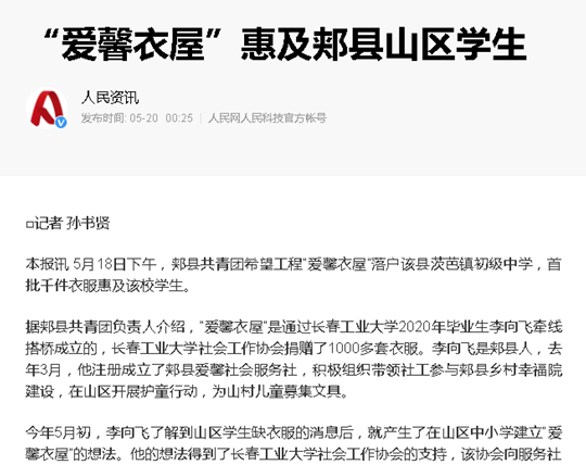 (通讯员:杨海龙)在beat365唯一官方网站第七届社工文化节举办期间,我校2020届社工专硕李向飞在河南郏县创办专业社工机构——“爱馨社工服务社”,结合地方实际,向社会发出为郏县留守困境青少年捐献衣物活动的倡议。
