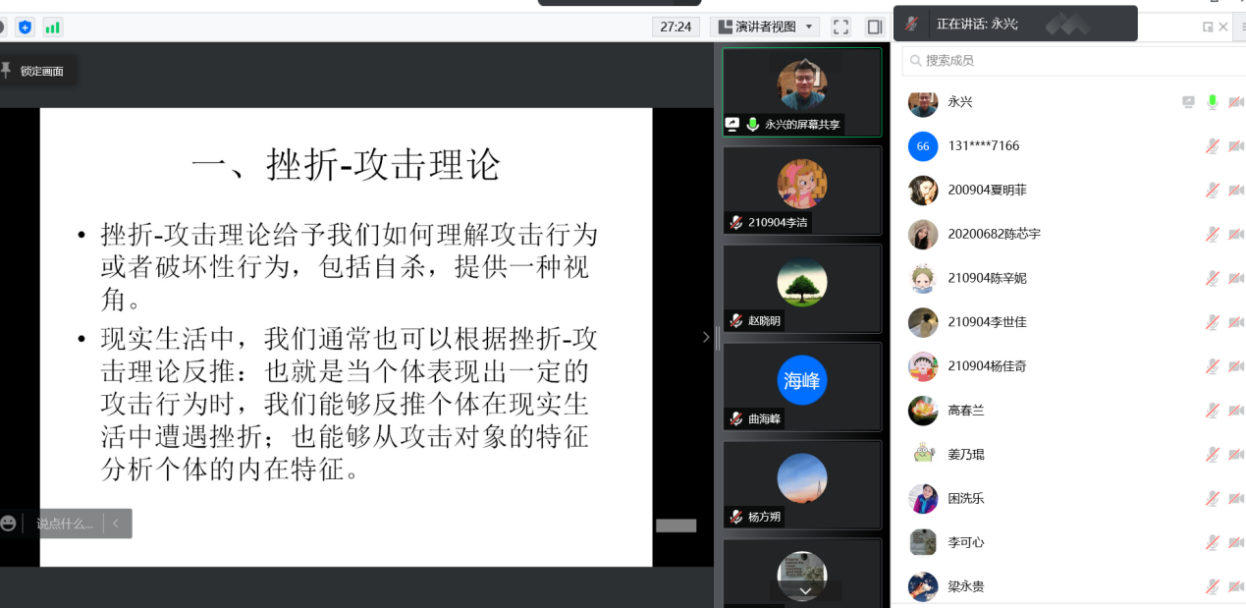 2022年3月19日晚,公共管理学院首轮抗疫心理关爱系列讲座第三讲开讲。本期主讲教师为社会工作系刘永兴老师,讲座主题是《疫情封闭环境大学生破坏性行为的发生与消解——基于挫折理论》。此次讲座的目的在于向全校师生普及心理健康知识,在特殊时期为同学们提供心理辅导以及启迪社会工作系的学生在未来实务工作中对于解决问题有更多的思考。