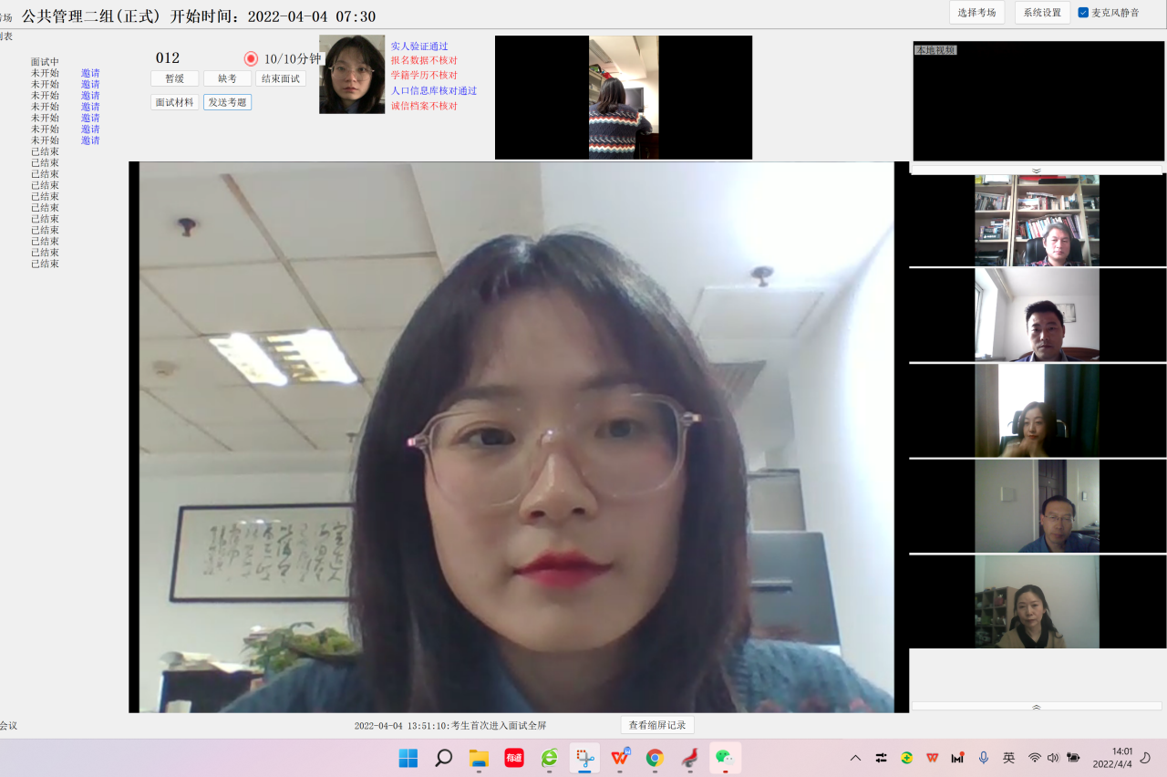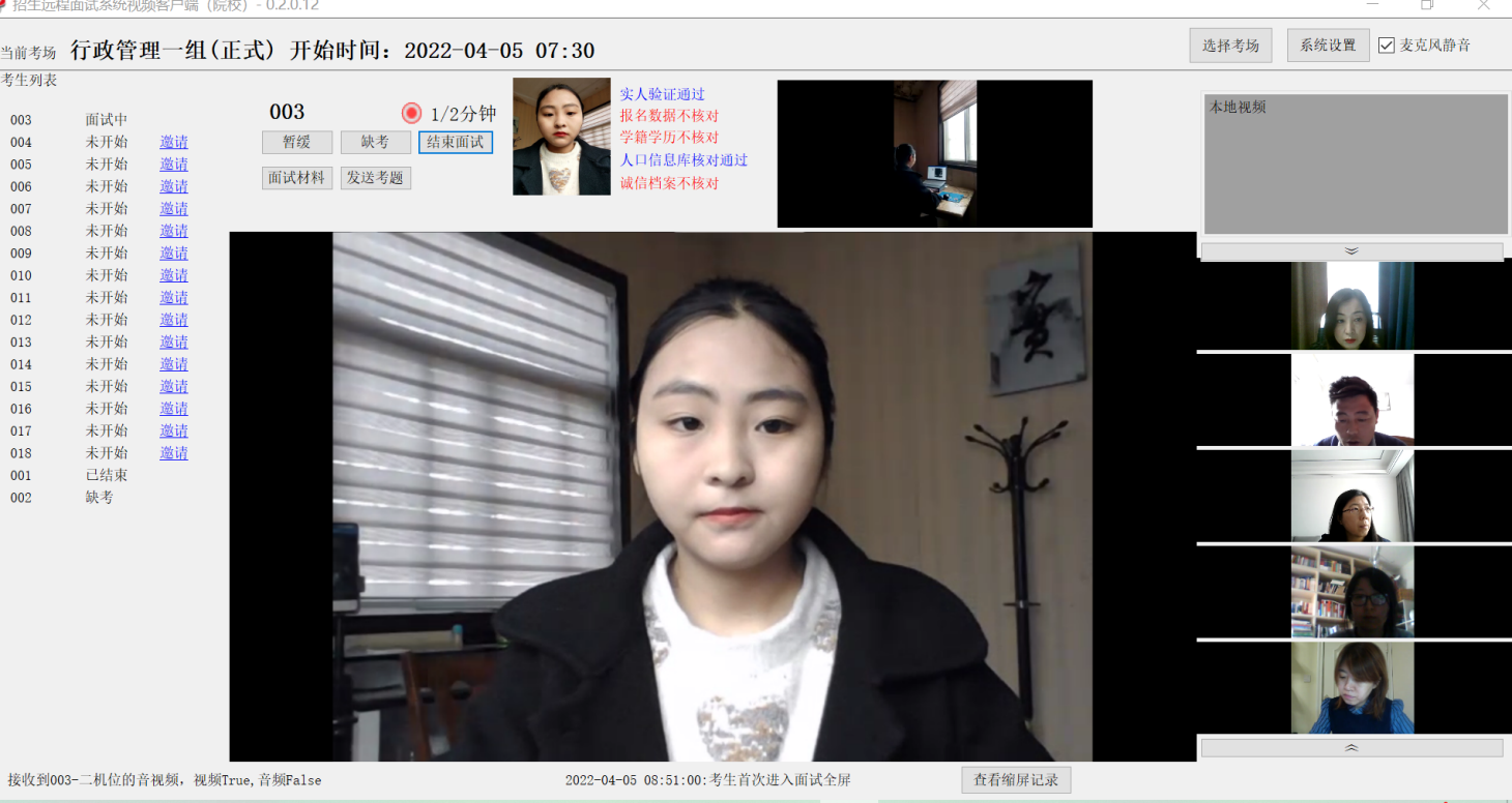 与往年线上复试不同的是,今年受疫情影响,全体老师都是居家封闭状态,需要考官各自用账号登录远程招生系统网址参加复试,这涉及到居家老师的设备是否满足复试要求以及预防网络卡顿等其他临时问题的出现。2022年3月21日,学院院长韩小威、副院长吕红组织全体参加复试的老师召开紧急工作会,传达了今年复试的文件精神、介绍了今年复试的操作方式、提出了对复试考官的具体要求,并作出突发情况的紧急预案,要求大家严阵以待。3月22-23日,学院组织所有考官们进行测试,查看设备音频是否清晰、视频是否流畅、打分操作是否成功等情况。4月1日下午,学院组织全体考生及复试秘书举行了模拟测试演练,所有流程均严格遵照正式复试环节操作,大部分秘书老师们因有以往的远程网络复试经验,对于流程和工作任务比较熟练,非常耐心地帮助考生熟练操作系统、正确摆放双机位、完成复试流程。由于复试准备时间非常紧张,秘书老师们给尚未进入复试QQ群的考生逐个打电话通知确认,告知其即将准备测试,并于4月2日、4月3日顺利完成了两轮测试。