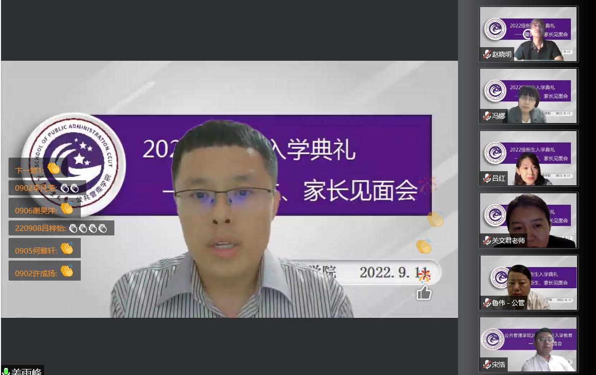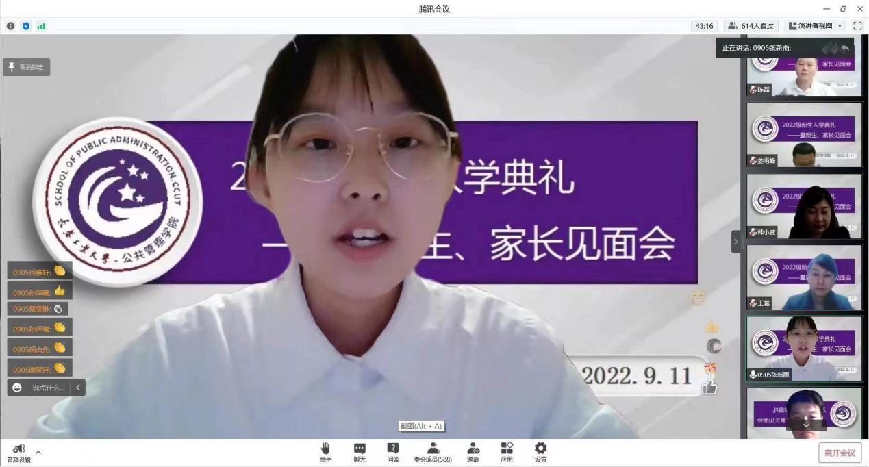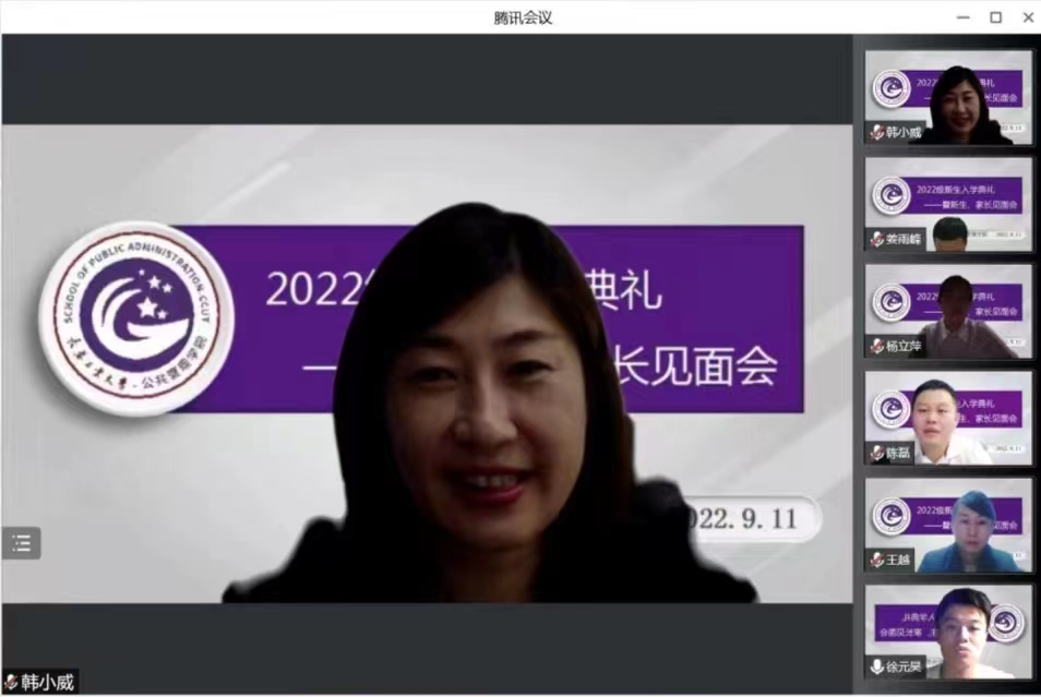 9月11日晚,公共管理学院通过腾讯会仪举行2022级新生入学典礼暨学生家长见面会。学院班子成员、各系书记主任、两办主任、教学秘书、新生辅导员以及全体本科、研究生新生及其家长参与加此次会议。会议由团委书记、学生工作办公室主任陈磊主持。