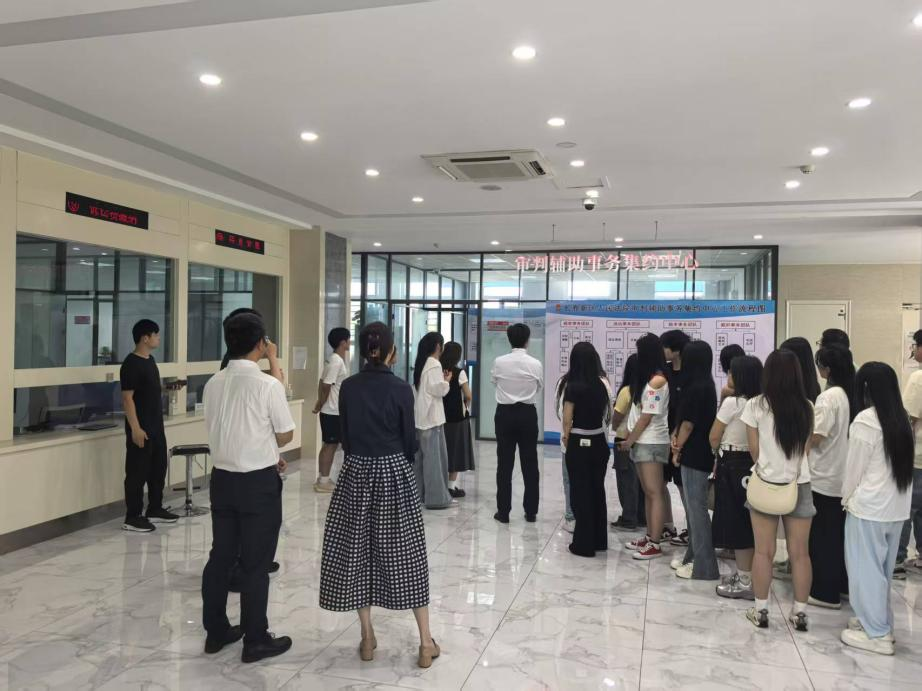 当日上午,同学们怀揣着对法律实践的期待与热忱,有序入法院。在新区法院立案庭副庭长姜飞飞的引导下,首先参观了诉讼服务大厅。姜飞飞副庭长向同学们详细介绍了立案登记、诉讼引导、多元解纷等功能区的运作模式,直观展现了司法便民的“第一扇窗口”。
